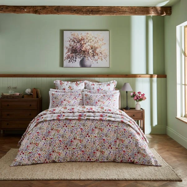 Embrace the charm of countryside flower meadows with this colourful floral print bedding range, designed to bring the beauty of nature into your bedroom. Crafted from luxurious 100% cotton sateen with a crisp white background and a 300 thread count, this versatile bedspread features delicate quilting and a ruffle edge for added elegance. Complete the look with matching bedding, curtains, and pillow sham to create a cohesive ambiance in your sanctuary. Coordinate effortlessly with the coordinating print reverse, available in two sizes for the perfect fit. Good things come to those who coordinate, so why not elevate your bedroom decor with this exquisite ensemble?