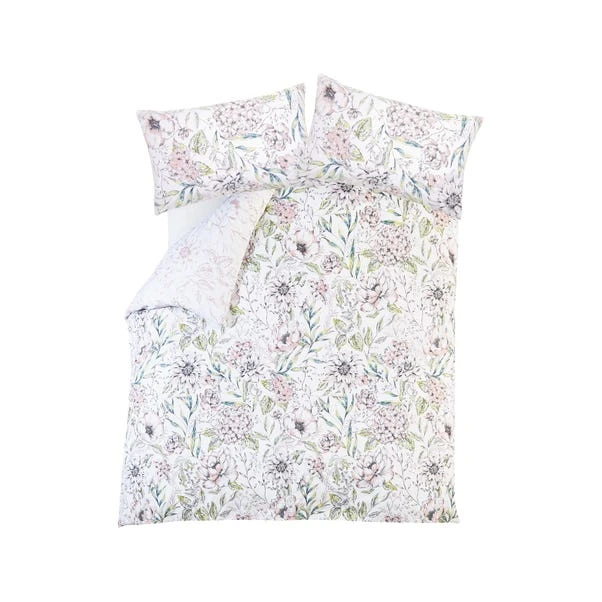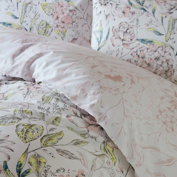 Refresh your bedroom with the Holly Willoughby Floral Sketch Duvet Cover & Pillowcase Set in Green. This set features a feminine hand-sketched floral design in greens and pinks, printed on a crisp white 200 thread count cotton percale. The fully reversible design with a pink floral sketch on the reverse adds versatility and charm. The set includes a duvet cover and pillowcases, with additional Oxford pillowcases available for purchase separately. Enjoy the convenience of button fastening and the luxurious feel of this beautiful bedding.